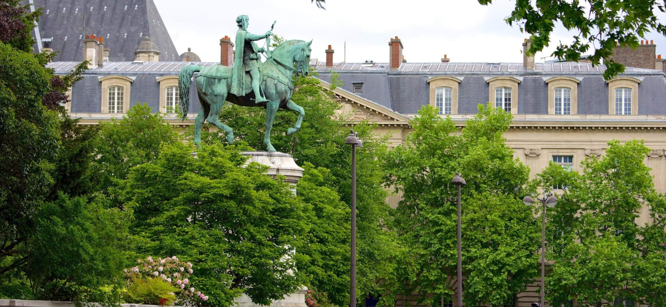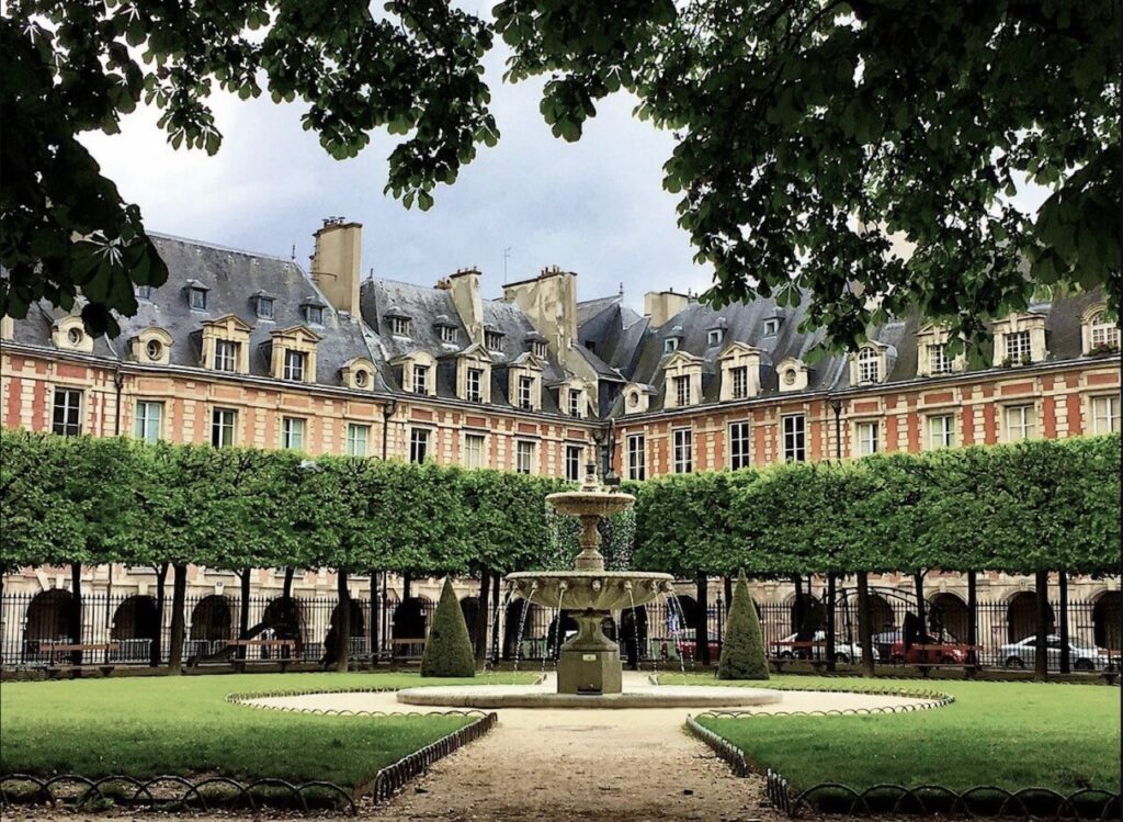 « « Un quartier à la taille d’un enfant. Où se trouve peut-être le plus beau jardin d’enfant de France, l’école publique de la Place des Vosges, qui s’est tout simplement installée dans l’un des hôtels particuliers de cette place appelée Place Royale avant que Bonaparte ne la renomme Place des Vosges (parce que ce département avait le premier envoyé des volontaires pour soutenir la patrie en danger sous la Révolution). Une place dont les proportions harmonieuses et les nombreux cafés qui la bordent permettent en toute saison un instant de repos sur l’un de ses bancs ou de s’allonger dès le printemps sur l’une de ses pelouses. La place des Vosges que les enfants appellent le « Grand Parc » abrite le jardin caché de l’Hôtel Sully, un véritable mouchoir de poche avec son somptueux chêne vert.