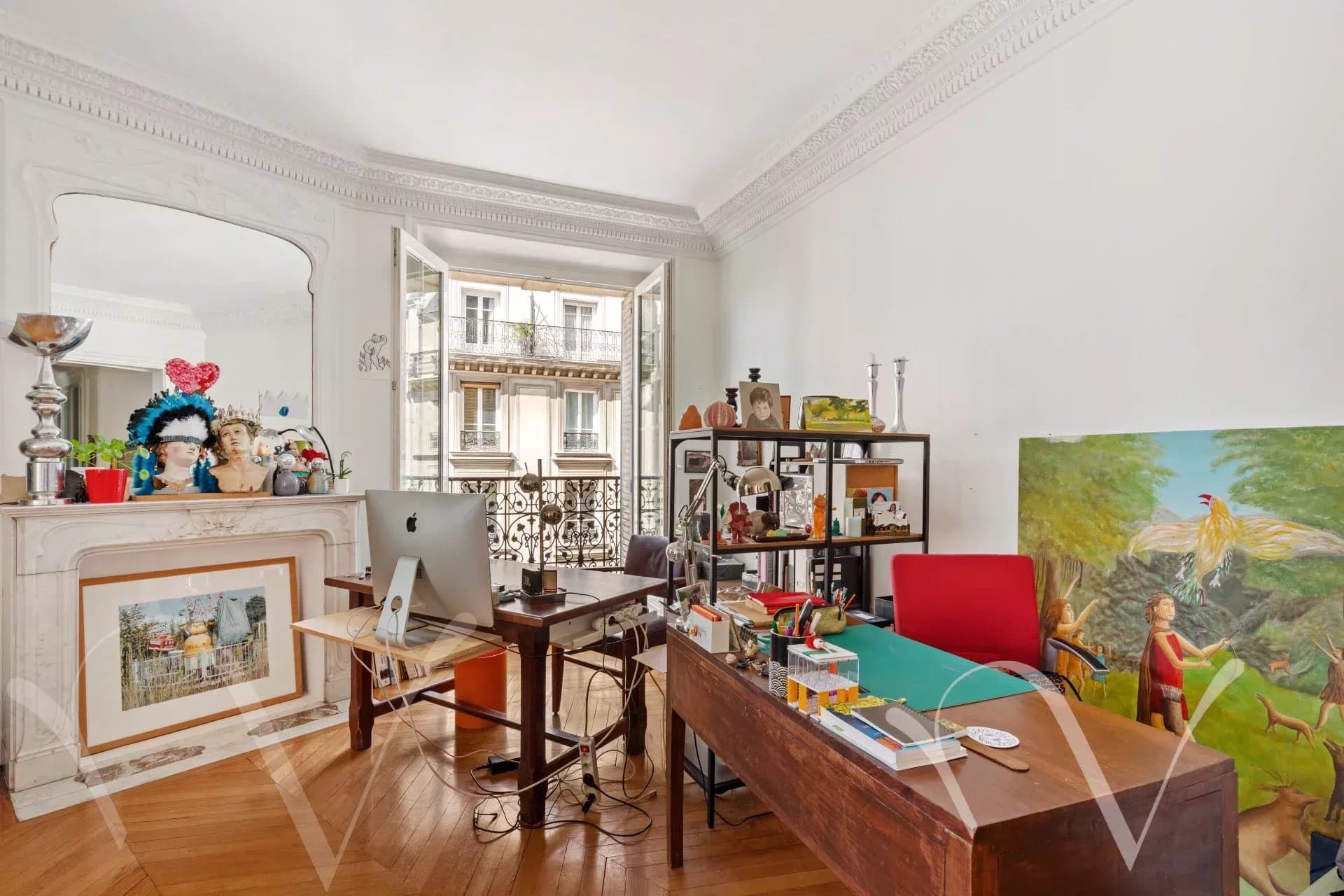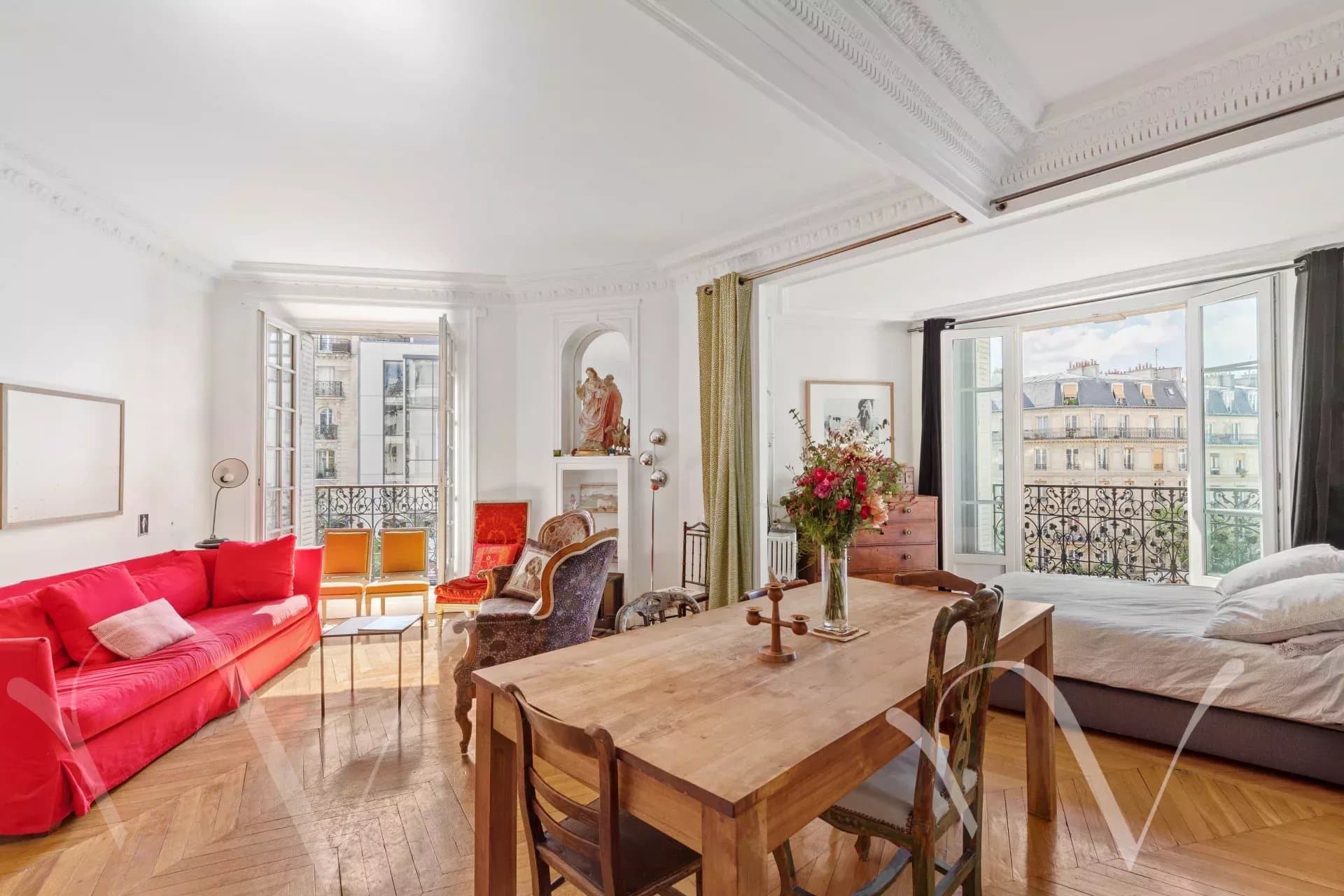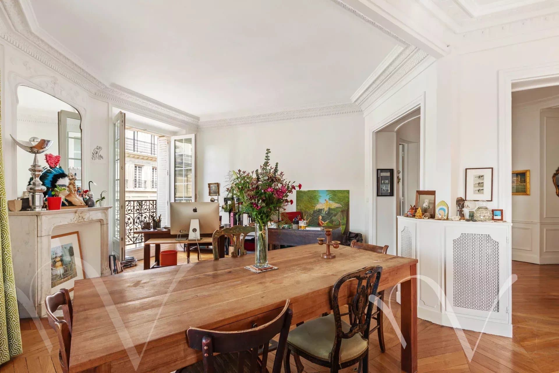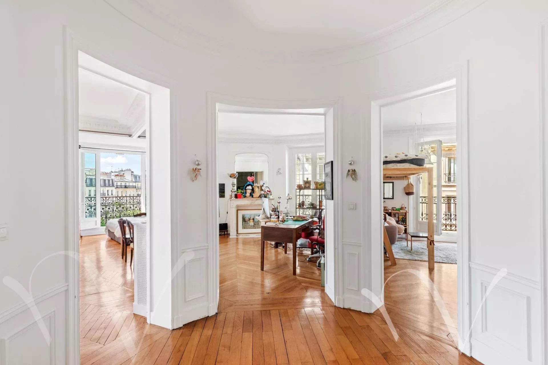 D’une surface de 123 m² loi Carrez, il comprend une agréable réception en angle avec une élégante rotonde, trois grandes chambres, deux salles d’eau, une cuisine séparée. La générosité des volumes et la hauteur sous plafond procurent élégance et confort à l’ensemble.