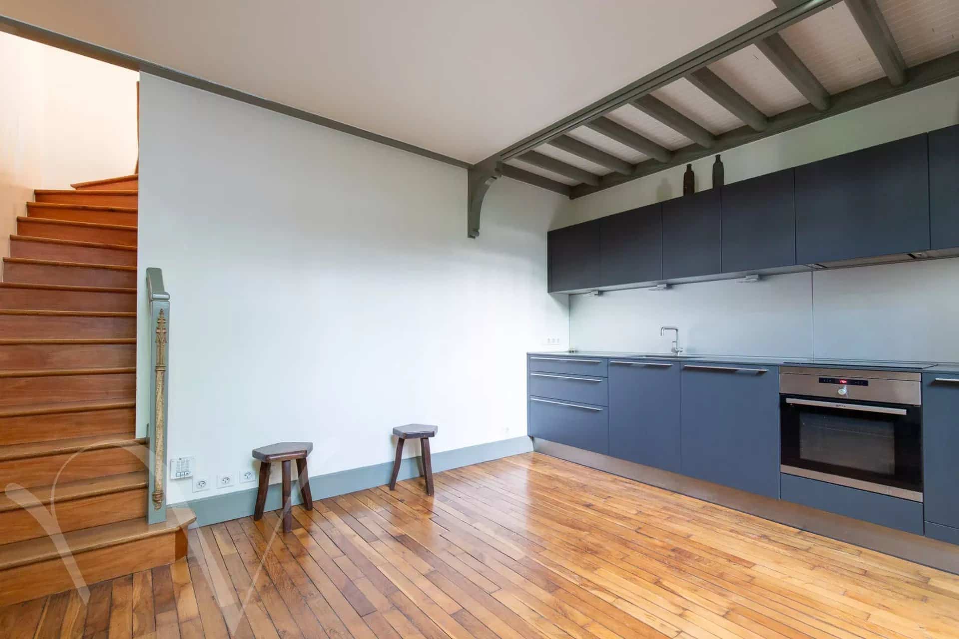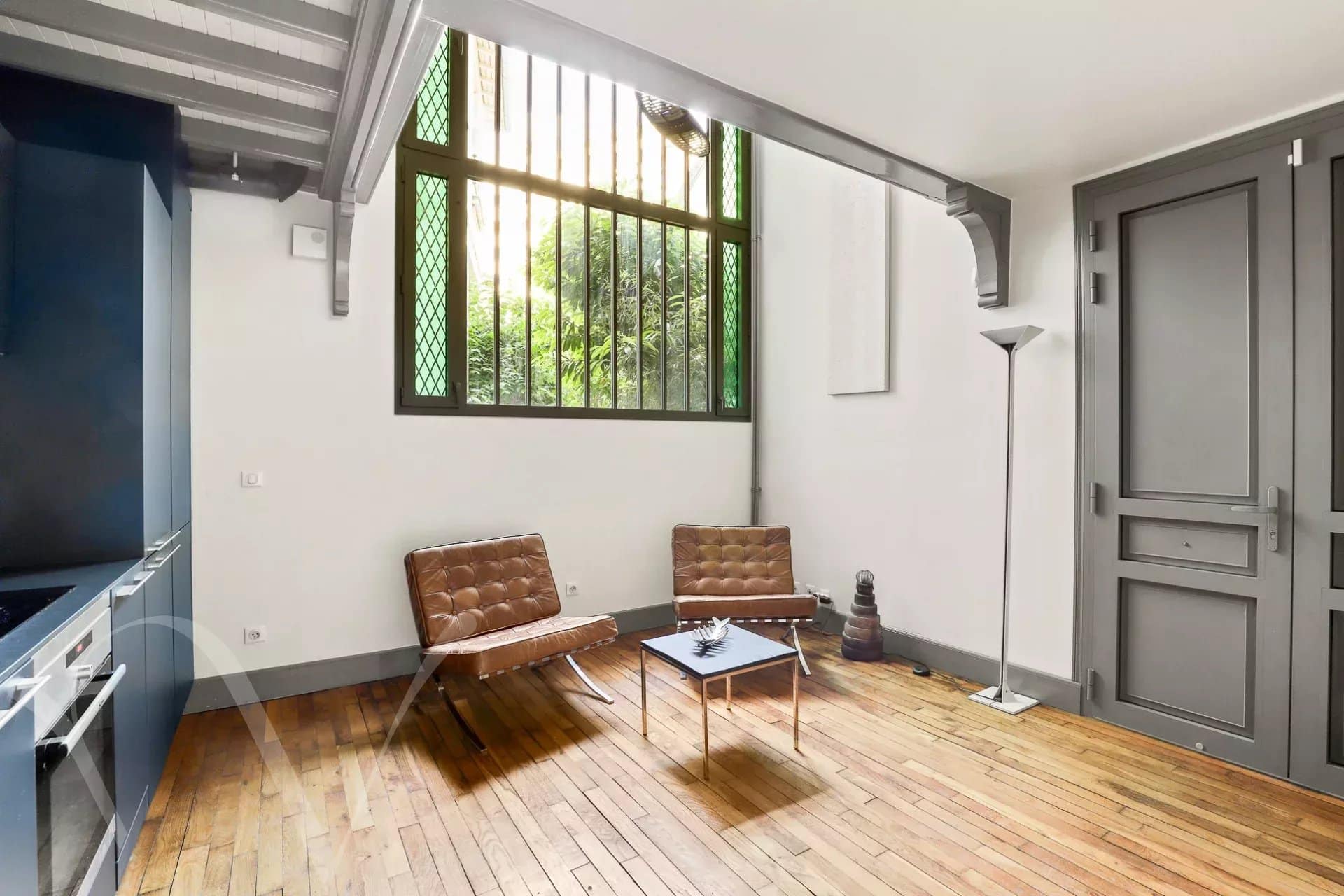 Exclusivité. Un bel atelier d’artiste de 42.5 m² en parfait état au sein d’une copropriété charmante au coeur du quartier Edgar Quinet, offrant une double exposition sur rue et cour jardin. Au rez-de-cour, se trouve une pièce de réception avec espace cuisine et une large verrière atelier.