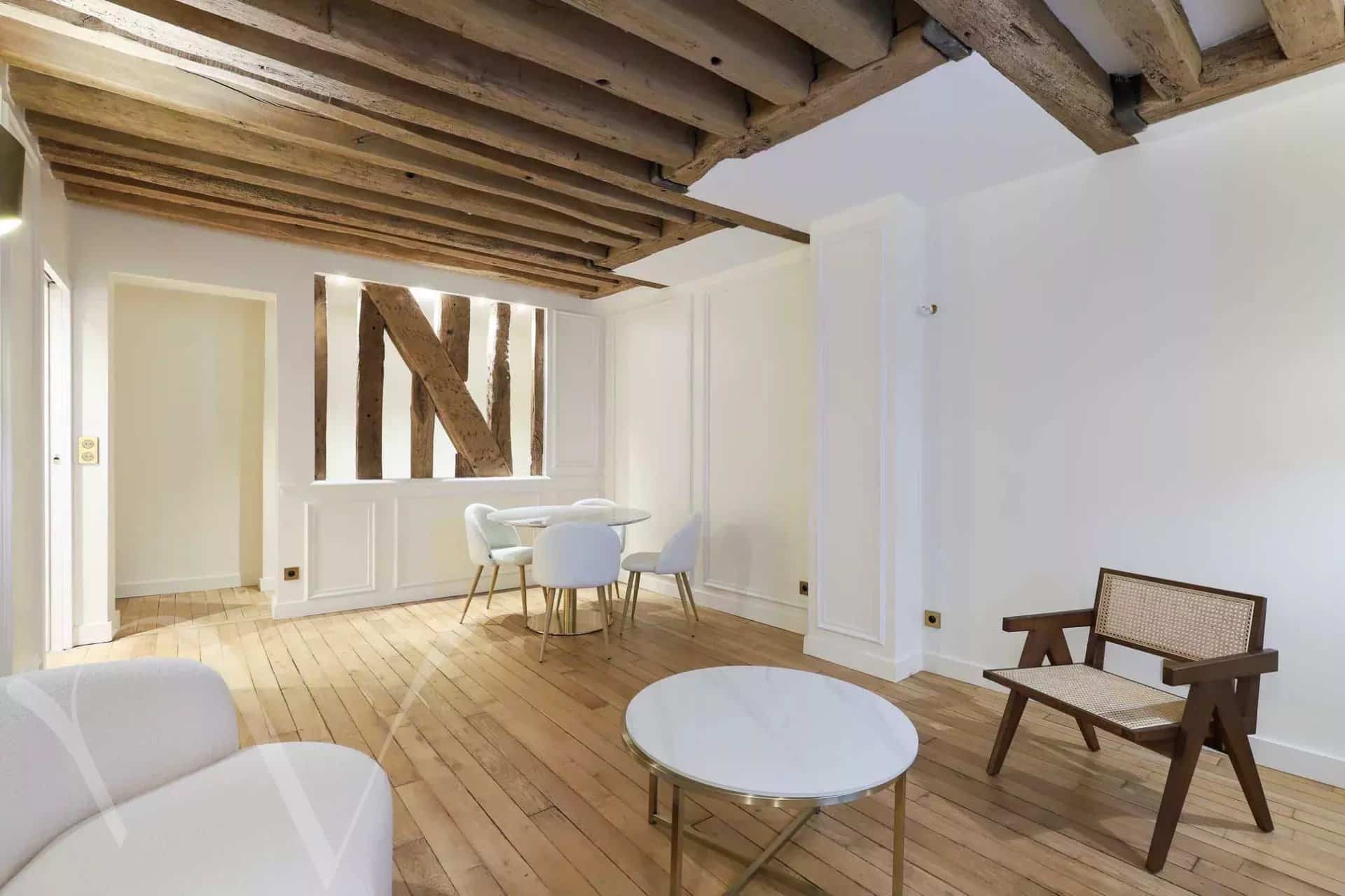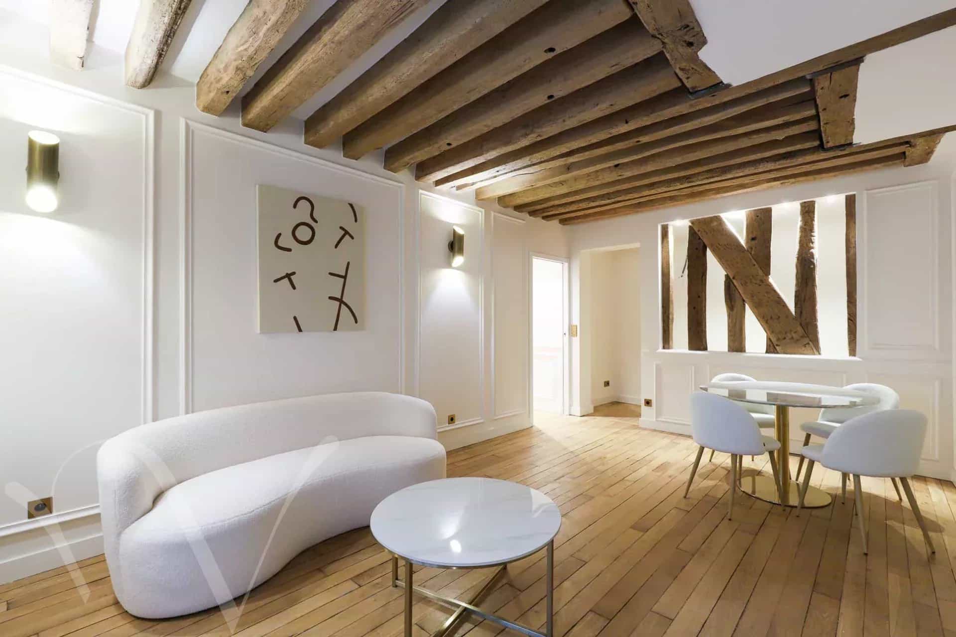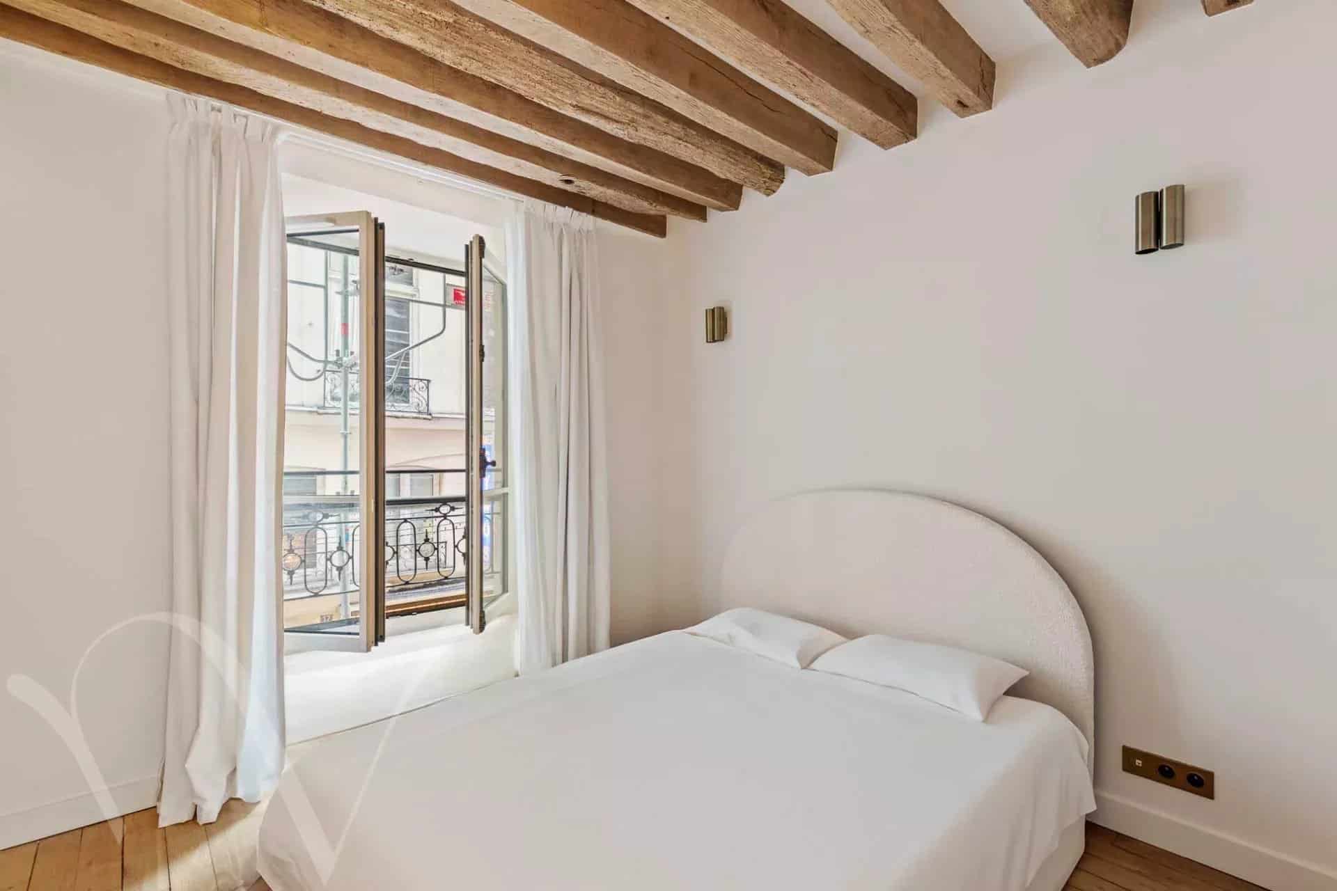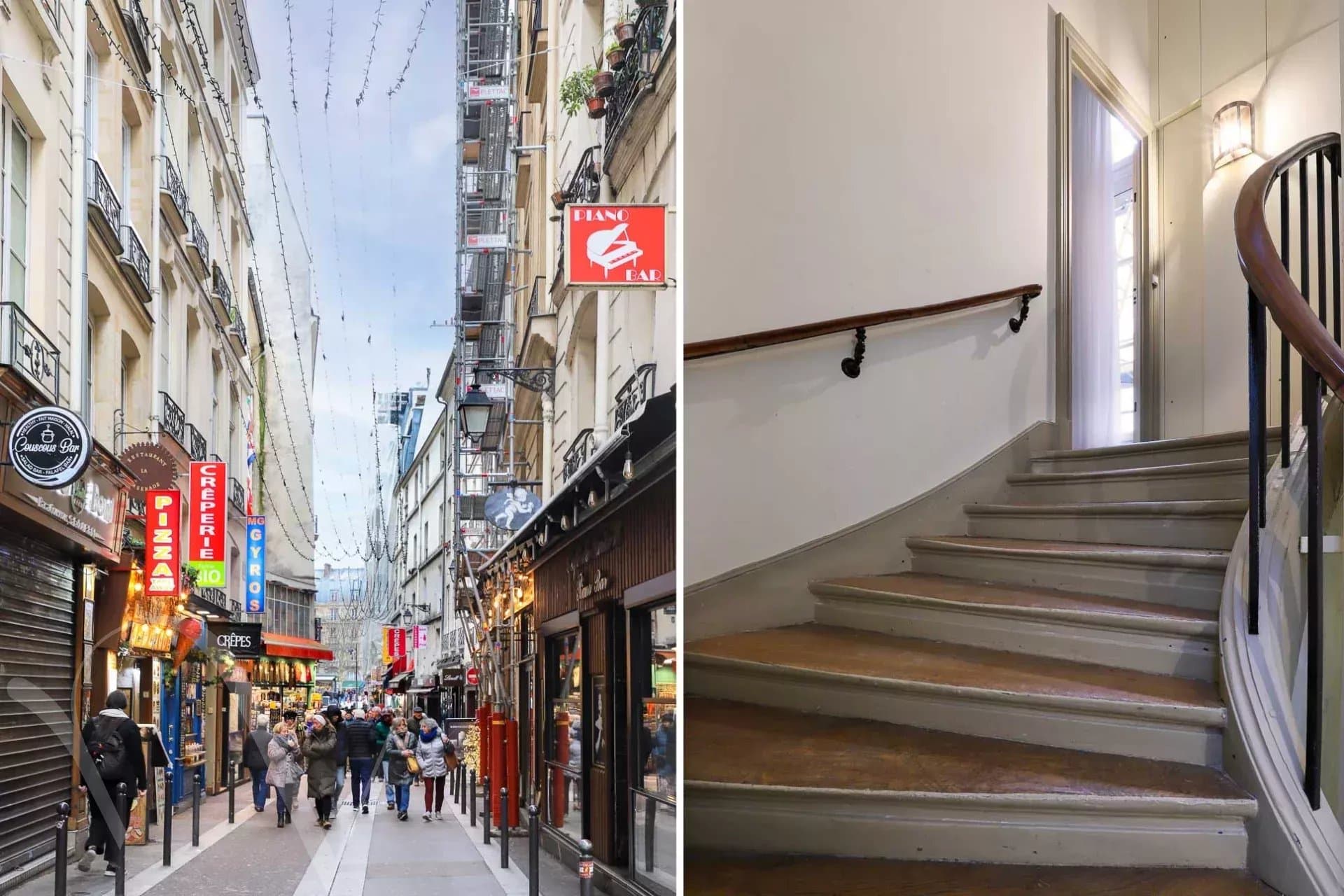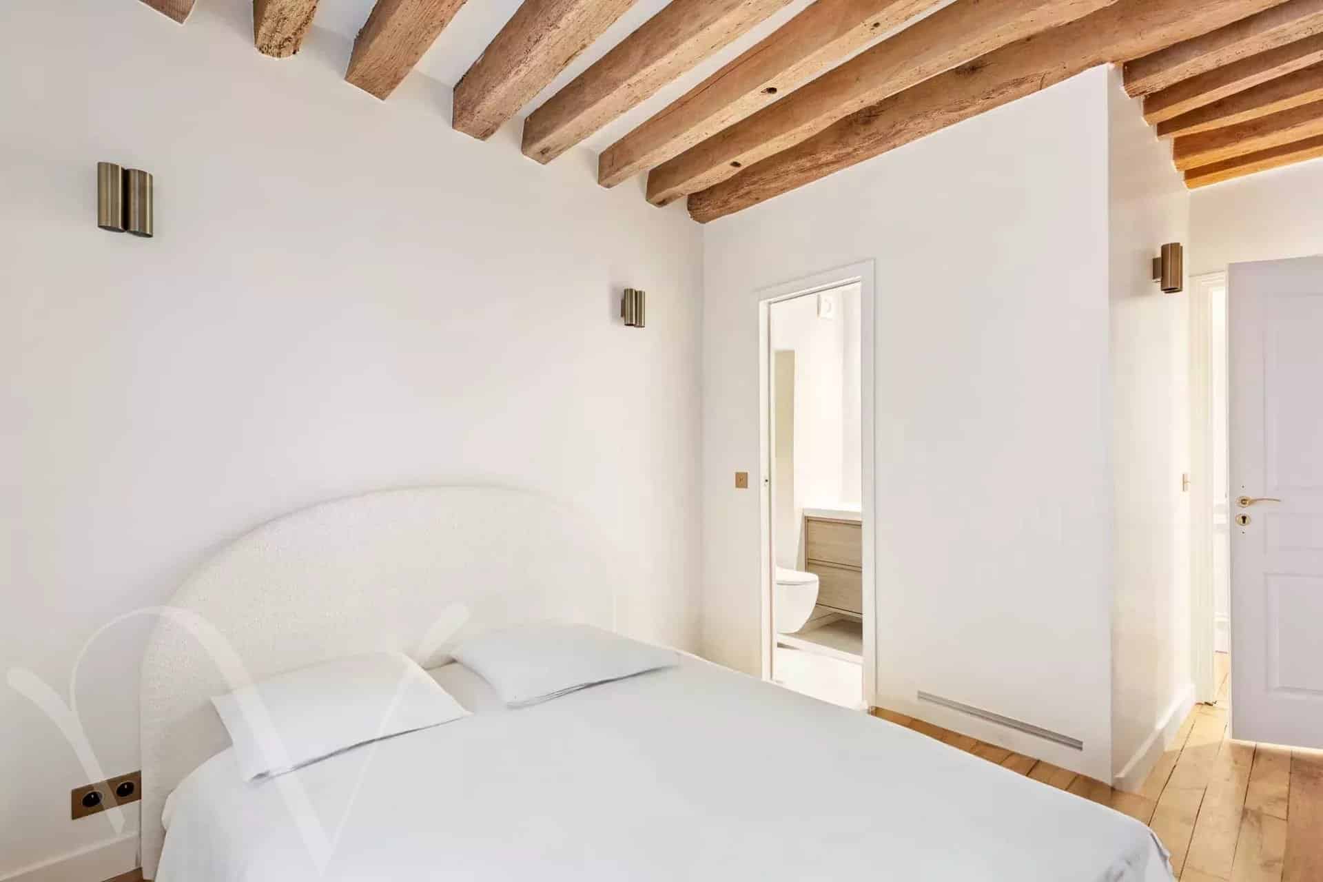 Dans bel immeuble en Pierre de Taille, au premier étage appartement de 52 m² entièrement et luxueusement rénové composé d’un salon sur la rue de la Huchette avec des jolies poutres, une chambre en suite avec sa salle de douche avec toilettes, une cuisine équipée et des WC d’invités. Climatisation.