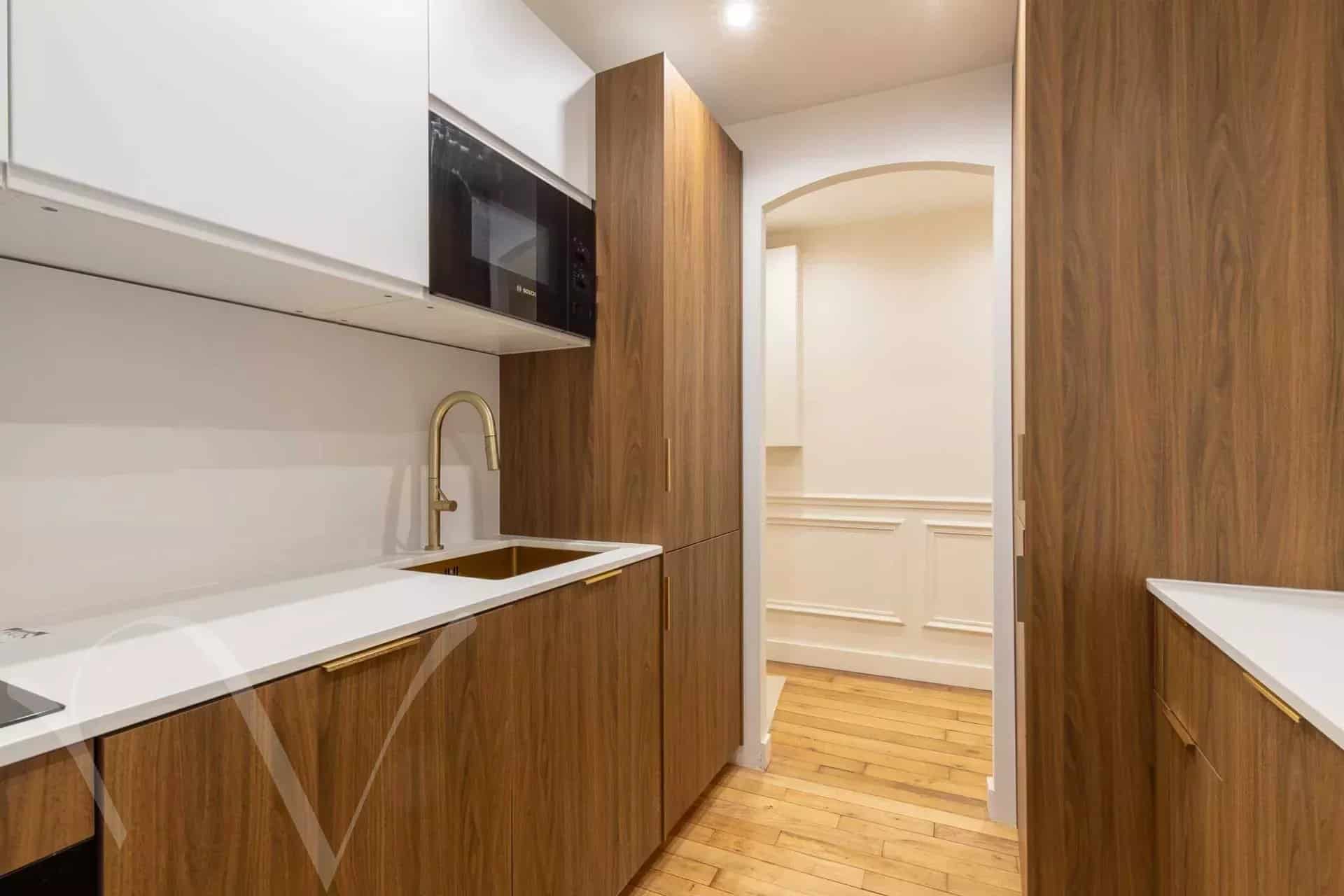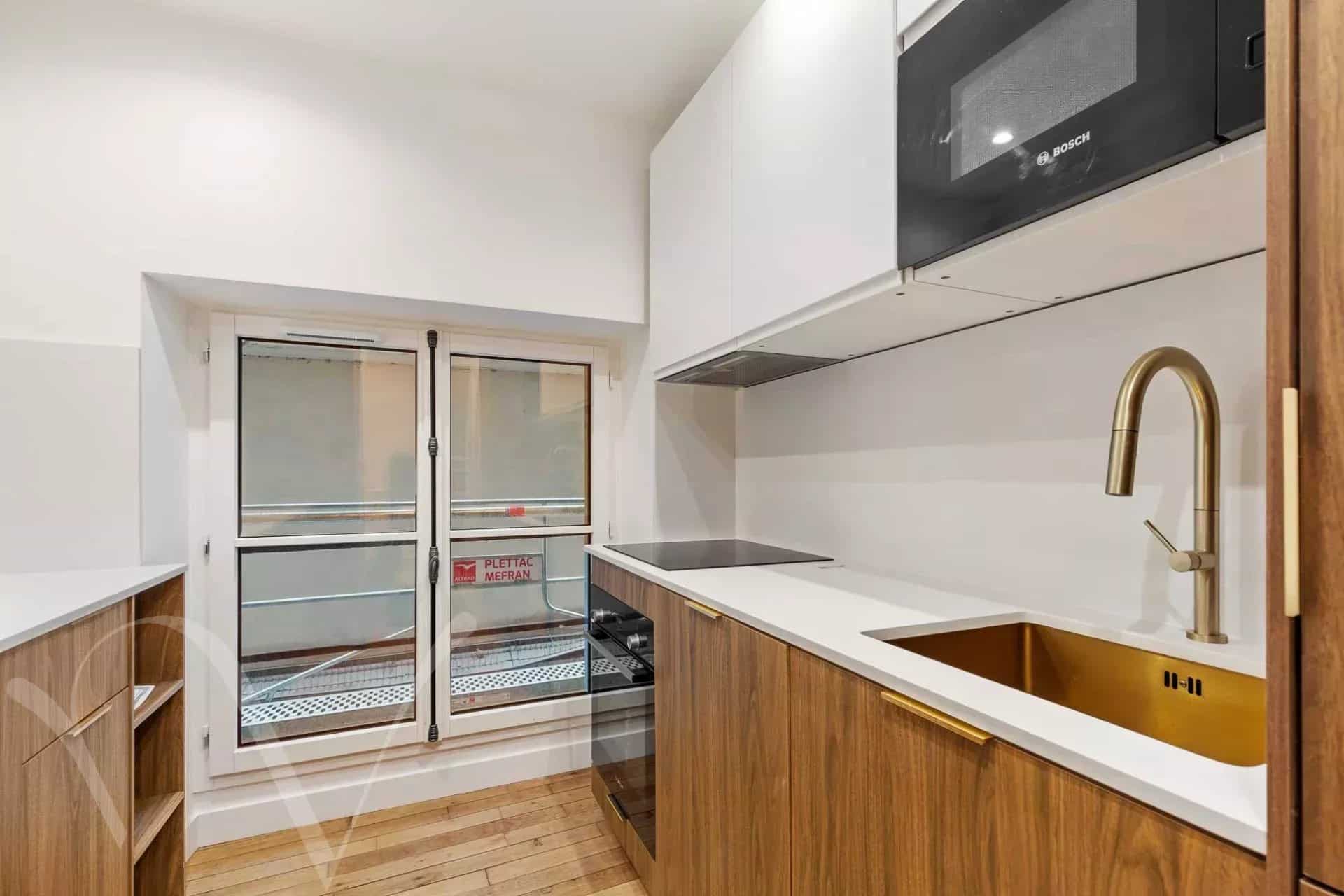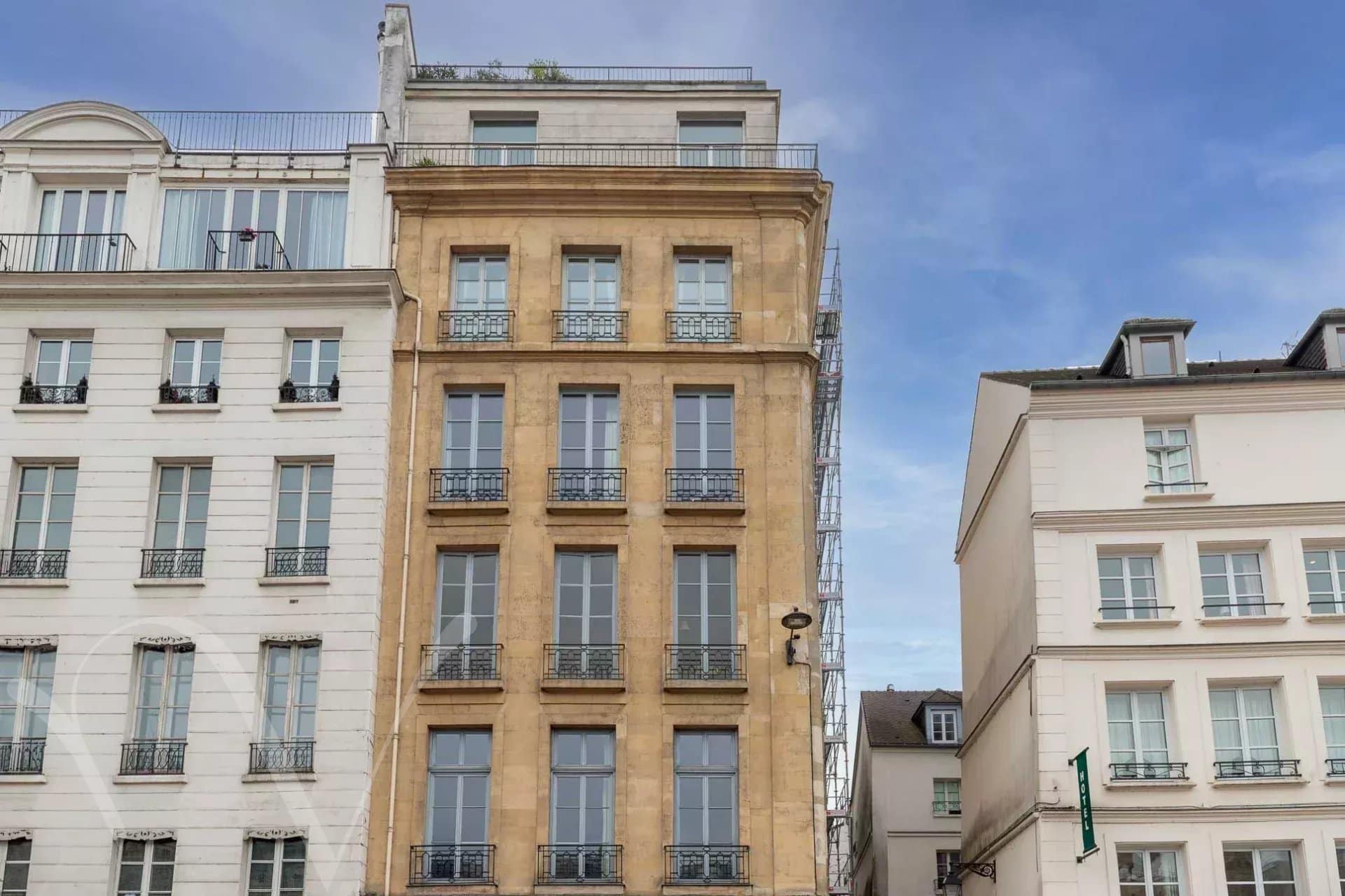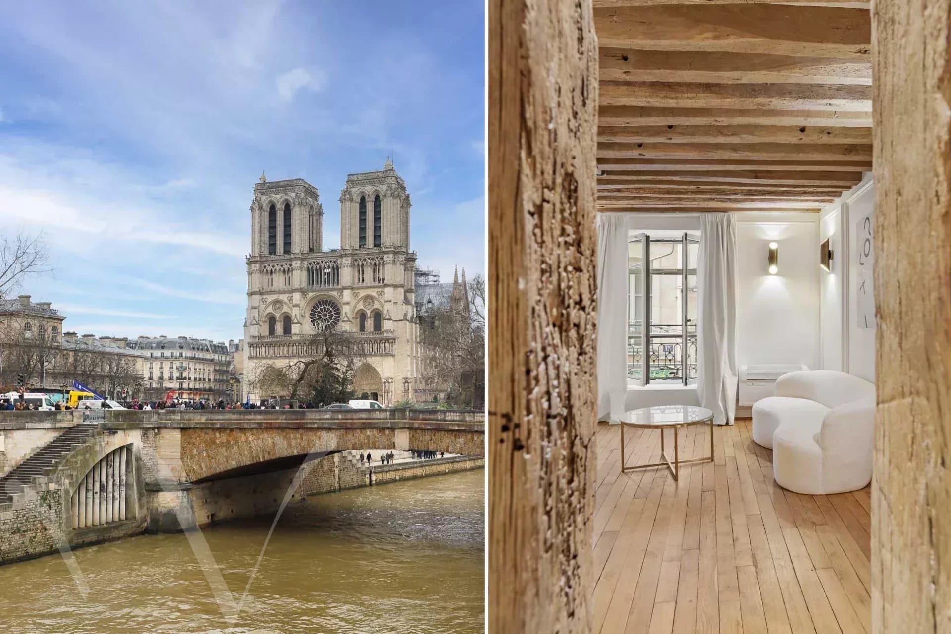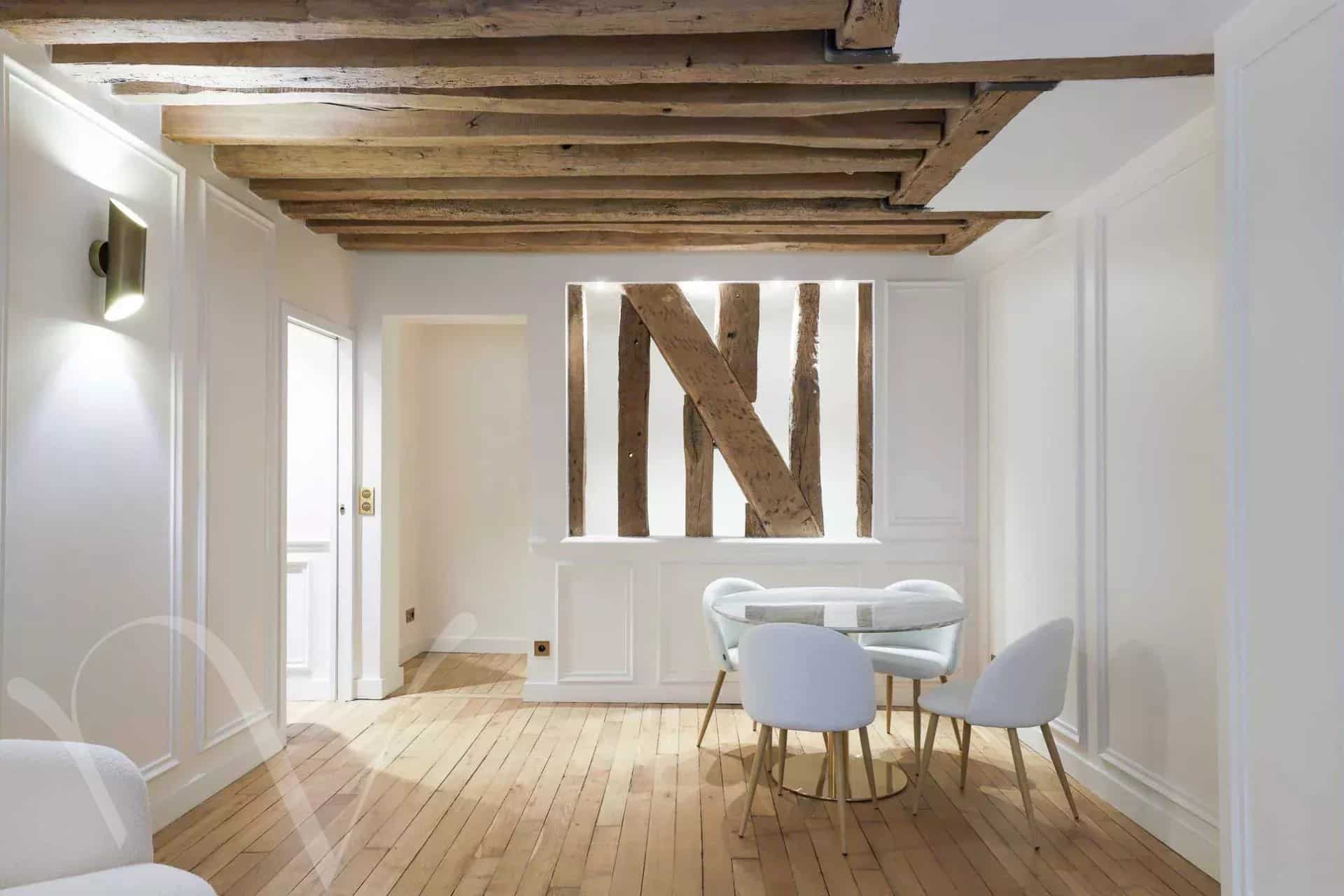 Dans bel immeuble en Pierre de Taille, au premier étage appartement de 52 m² entièrement et luxueusement rénové composé d’un salon sur la rue de la Huchette avec des jolies poutres, une chambre en suite avec sa salle de douche avec toilettes, une cuisine équipée et des WC d’invités. Climatisation.